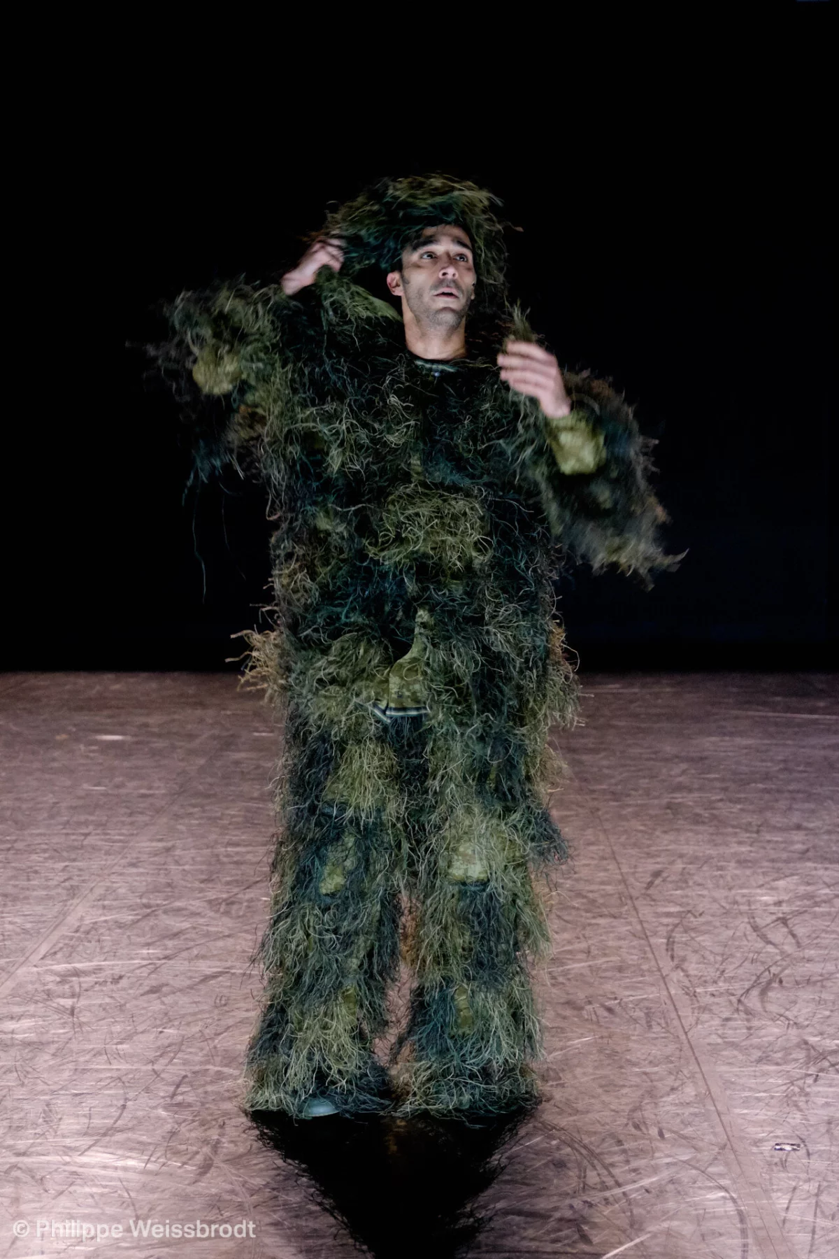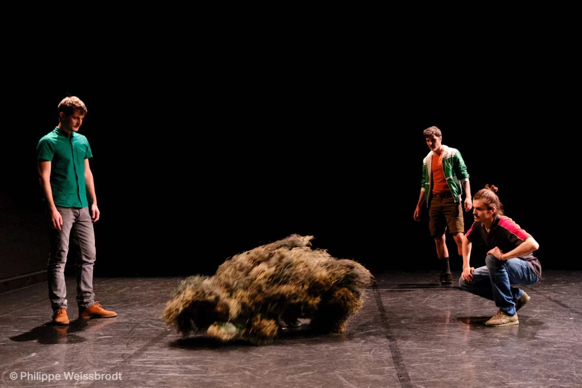 Le premier temps de la pièce développe physiquement un équivalent au discours des chasseurs. Ils défendent leur pratique en se réclamant du retour à la nature, de la régulation de la faune, d’une communauté retrouvée, d’un lien à la tradition… et font de la chasse une romantique traque forestière. Pour évoquer ces rapports utopiques au sauvage, des codes peu usités dans la danse contemporaine sont mobilisés et renvoient à une forme de naïveté : par exemple une copie de la gestuelle des chasseurs en action, trouvée sur YouTube.