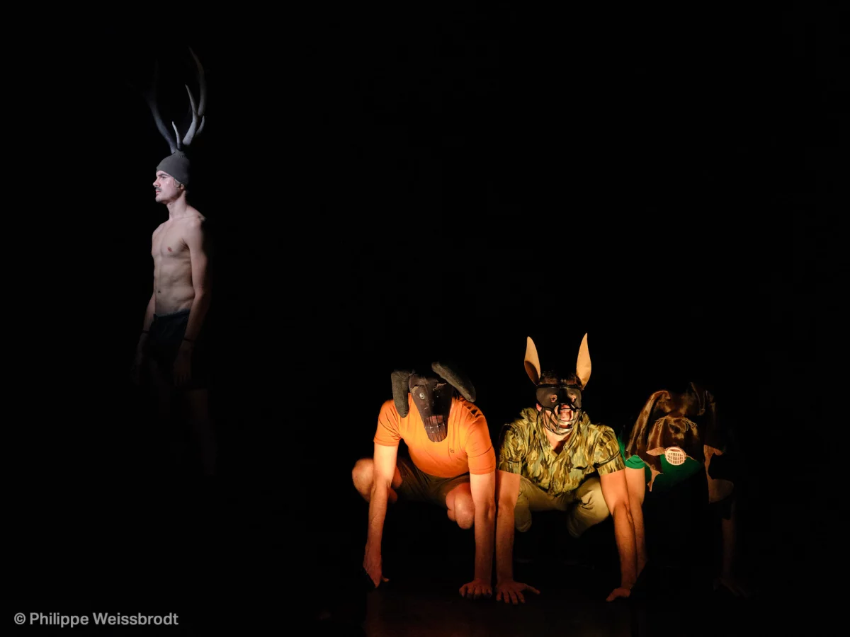 Le spectacle Actéon aborde le monde de la chasse et utilise le mythe tout à la fois comme support et comme dénouement ; comme contexte de narration et comme conclusion dramaturgique : la dialectique homme/sauvage (partie 1 & 2 ci-dessous) et la métamorphose cathartique (partie 3).