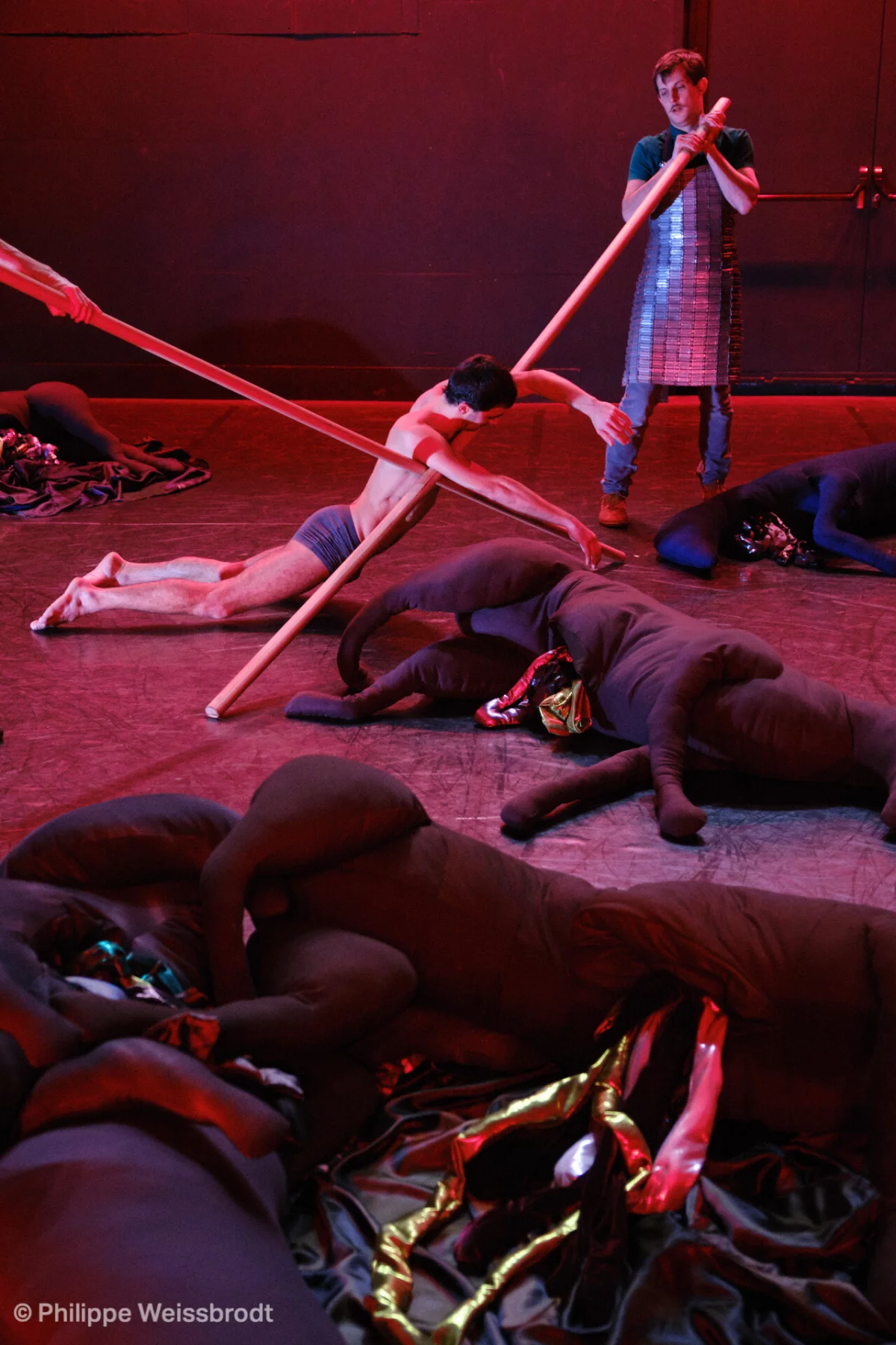 Le plateau est quasiment nu tout au long de la pièce : seules des carcasses en tissu jonchent le plateau dans le 2ème acte, et des panneaux LED sont maniés par les danseurs.