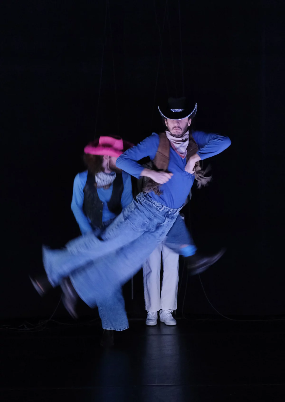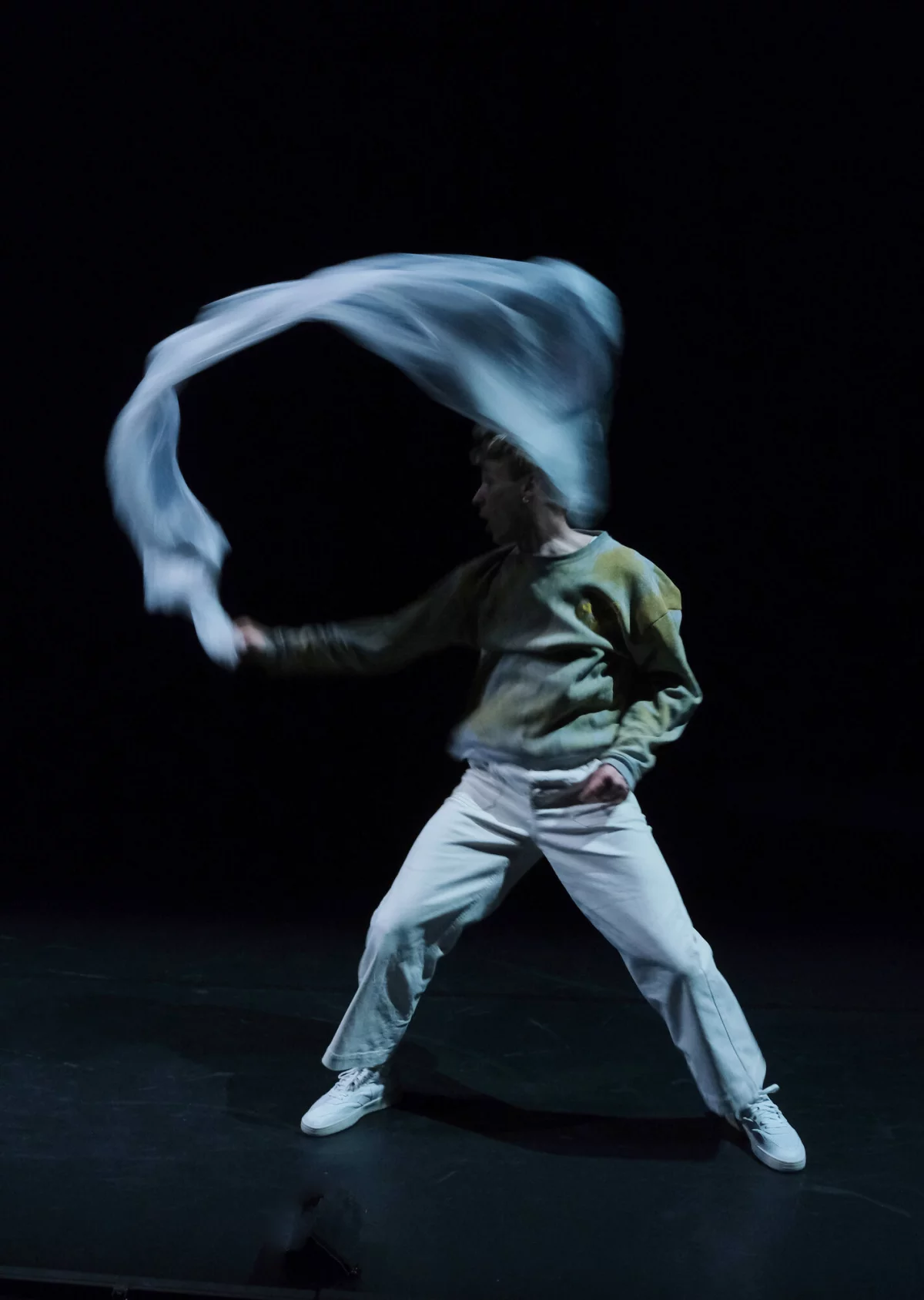 Nous sommes à la conjonction d’un théâtre d’objets et d’une danse qui s’appuie toujours sur des situations très concrètes, où les mots sont rares et les images étonnantes. Après le dispositif magique d’Hocus Pocus, nous continuons d’explorer ce lien des corps avec un décor, ici en constante transformation. Ce sont des bâches de toutes natures qui sont employées, jouant avec l’air, manipulées, prenant une multitude de formes évocatrices, dans une sorte d’artisanat de l’imaginaire, offrant aux personnages les situations dans lesquelles ils vont évoluer.